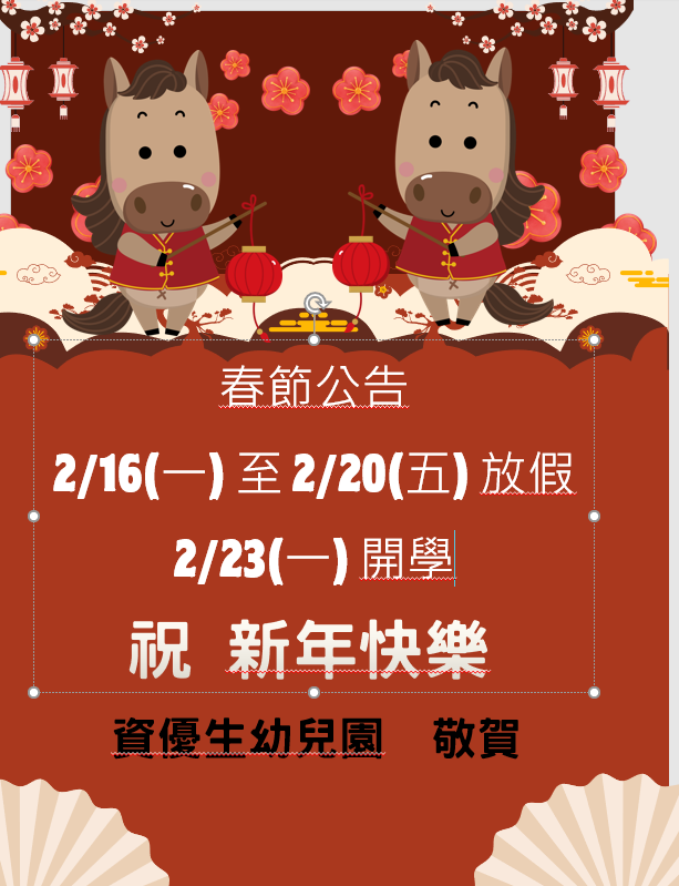 2026年2/16(一)~2/20(五)農曆春節,2/23(一)正常上課!以此提醒諸位家長,方便您安排全家的春節活動。 敬祝 春節快樂!
